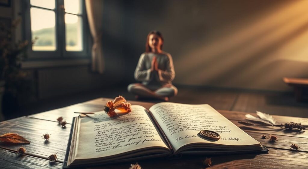 Adding spiritual elements to journaling brings comfort and a broader perspective. It invites a sacred conversation with grief, letting faith help in healing.